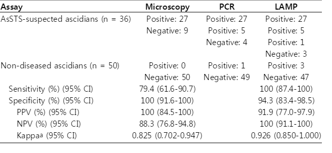 Table 2). Of the 36 AsSTS-suspected ascidians, positive results by microscopy, PCR, and LAMP were 27 (75%), 32 (89%), and 33 (92%), respectively. All the 27 positive samples by microscopy were positive by PCR and LAMP. Of the 9 negatives by microscopy, 5 samples (56%) were positive by PCR and LAMP and thus considered false negatives. We attribute these 5 false negatives by microscopy to have been caused by a low parasite density in early infection. Of the 4 negatives by microscopy and PCR, 1 was positive by LAMP. Of the 50 non-diseased ascidians (Grade 1) subjected to the same 3 tests, all were negative by microscopy, and of these 50 negatives by microscopy, 1 was positive by PCR and LAMP and 2 were only positive by LAMP.