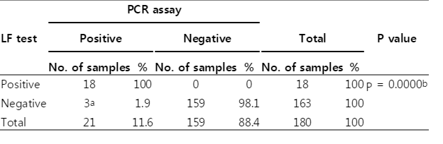 Table 3.Concordance (number and percentage) of the LF test results with the PCR assay