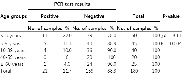 Table 4.PCR test results of 180 samples distributed by age groups