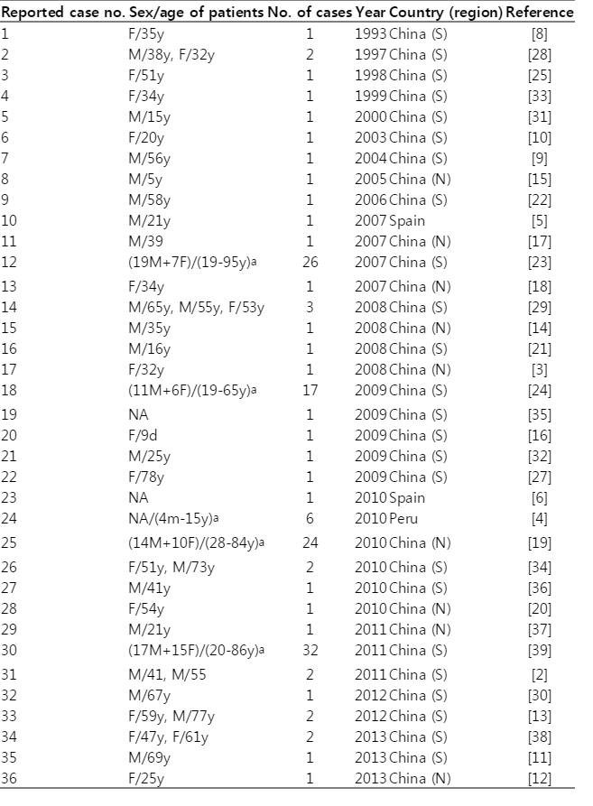 Table 1). Among the 136 cases, more than 3 quarters were identified in the southern area of China. There was only 1 case which was reported so far on the basis of available information in Chongqing but checked out in Shanghai in 2000 [