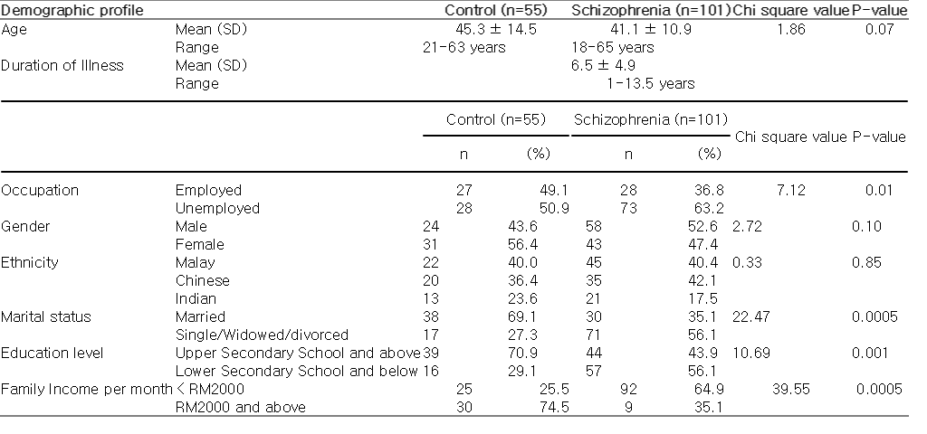 Demographic profile Control (n=55) Schizophrenia (n=101) Chi square value P-value