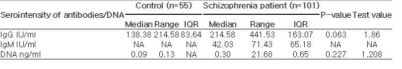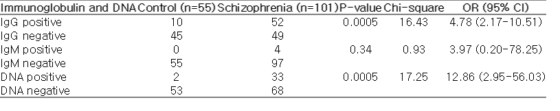 Immunoglobulin and DNA Control (n=55) Schizophrenia (n=101) P-value Chi-square OR (95% CI)