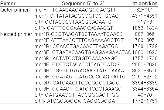 Pvcrt-o were first amplified with a pair of outer primers; mdrF-mdrR and crtF-crtR, respectively. The outer PCR was carried out in a total volume of 20 μl in the following reaction mixture: 0.2 μM of each primer, 2.5 mM MgCl
