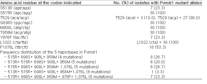 Pvmdr1 were observed, of which the majority of the isolates (14/30) carried 5 mutations (513R+515R+698S+908L+958M and 515R+ 698S+908L+958M+1,076L). Isolates carrying 4 mutations (515R+698S+908L+958M) and 6 mutations (513R+515R+698S+908L+958M+1,076L and 515R+698S+908L+958M+976F+1,076L) were found in equal frequency (8/30). Isolates carrying 1,076L were observed in 16 isolates (53.3%), whereas isolates carrying both 976F+1,076L were observed in 7 isolates (23.3%).