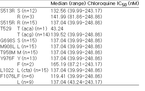 Table 3.The polymorphisms in Pvmdr1 gene at the 4 highly polymorphic loci (S513R, Y976F, F1076L, and T529) including the other 5 loci and IC50 values of 15 selected P. vivax isolates with wild-type and mutant genotypes