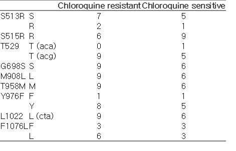 - 22. Nomura T, Carlton JM, Baird JK, del Portillo HA, Fryauff DJ, Rathore D, Fidock DA, Su X, Collins WE, McCutchan TF, Wootton JC, Wellems TE. Evidence for different mechanisms of chloroquine resistance in 2 Plasmodium species that cause human malaria. J Infect Dis 2001;183:1653-1661.