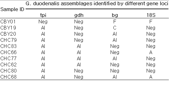 Table 1); 4 samples (CBY20, CHC62, CHC79, and CHC83) were typed at 2 loci; 1 sample (CHC80) was typed at 1 locus. Whereas, single infection with assemblage F was found in 1 sample (CBY01) which was typed at 2 loci. A mixed infection with 2 assemblages (assemblage A and C) was detected in 1 sample.