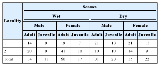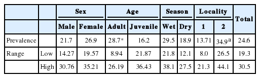 Older cats had a significantly higher infection rate, 46 adult cats had a significantly higher intensity and infection rate with trematodes than juveniles did (P=0.03). In addition, trematodes showed significantly higher prevalence and intensity in cats which were trapped in Locality 2 than in Locality 1 (P=0.03). These data were very much influenced by prevalences of Heterophyes spp., which constituted the majority of the trematode community. Heterophyes spp. were influenced by age and site but not by season and gender; significantly higher (P=0.00) prevalences were observed in adults and in Locality 2 when compared to juveniles and Locality 1, respectively (Table 3). The prevalence of trematode infection was higher (29.5%) in the wet season than in the dry season (18.9%), while the intensity of infection was higher in the dry season (mean=279.1 burdens) than in the wet season (mean=84.9 burdens). However, these differences were not statistically significant (P>0.05).