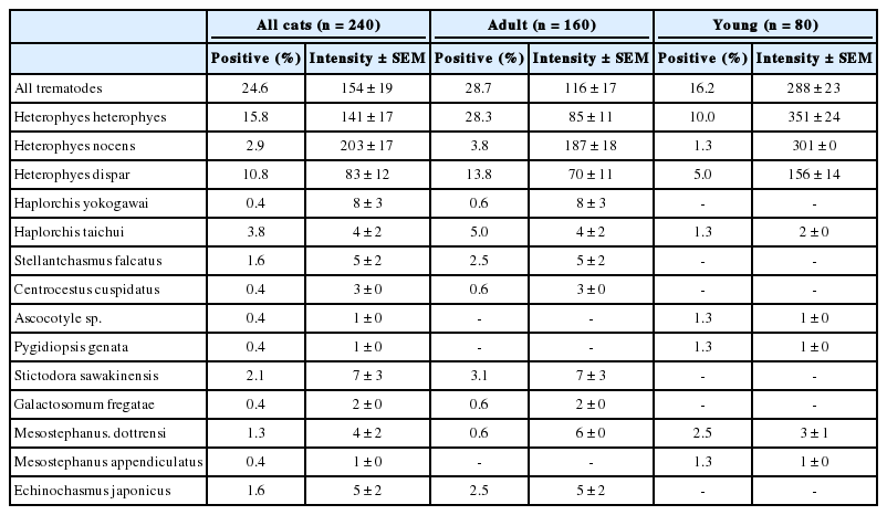 A total of 240 stray cats were examined, 117 from Locality 1 and 123 from Locality 2 (Table 1). Cats were captured around houses of fishermen, fish markets, and trash containers. A total of 59 (24.6%) cats were found to be infected with FZTs, and 23 (39.0%) being infected with more than 2 different species. Total 14 species of FZTs were recovered in the small intestine of cats. Among them, the great majority (11 spp.) were members of the family Heterophyidae, 2 species (Mesostephanus dottrensi and M. appendiculatus) were those of the Cyathocotylidae, and only 1 species, Echinochasmus japonicus, belonged to the Echinostomatidae. Three species of the genus Heterophyes (H. heterophyes, H. dispar, and H. nocens) were detected in 15.8%, 10.8%, and 2.9% of stray cats examined, and their average numbers were 141, 83, and 203 worms per cat infected, respectively. Trematodes including Centrocestus cuspidatus, Galactosomum fregatae, Ascocotyle sp., M. appendiculatus, H. yokogawai, and Pygidiopsis genata showed the lowest prevalence (0.4%) and intensity (Table 2).