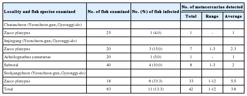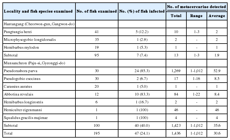 Table 3.Infection status of Clonorchis sinensis metacercariae in fishes from Hantangang and Munsancheon in Korea