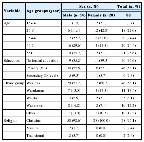 Table 1 summarizes social and demographic characteristics of the study participants. A total of 82 respondents were retained during the follow-up KAP survey. Of the retained cohort, two-thirds of respondents (n=54; 65.9%) were males and one-third of respondents (n=28; 34.1%) were females. A vast majority of respondents (n=79; 96.0%) were aged ≥25 years. Slightly more than a half of respondents (n=46; 56.1%) had primary education. However, a good proportion of respondents (n=30; 36.6%) had never been to school. Furthermore, the vast majority of respondents (n=78; 95.1%) were Christians. Slightly more than a half of respondents (n=46; 56.1%) belonged to Wazinza ethnic group.