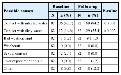 Respondents were asked how one can get infected with schistosomiasis. A vast majority of respondents (n=69; 84.2%) mentioned contact with infected water as the possible cause of schistosomiasis during follow-up survey compared to fewer (n=35; 42.7%) who said so during baseline survey. The difference was highly significant at P<0.0001. Contact with dirty water was also mentioned to be the cause of schistosomiasis by a good number of respondents (n=29; 35.4%) after the intervention compared to a few (n=12; 14.6%) before intervention. The difference was also significant at P<0.002. There were no significant differences for those who mentioned sexual contact or witchcraft, bad weather/wind, and over exposure in the sun (i.e., lay epidemiology) to be the cause of schistosomiasis (Table 2).