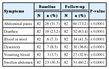 Dysentery 82 7 (8.5) 82 30 (36.6) < 0.0001