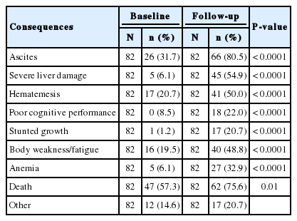 Respondents were also asked about the health consequences of intestinal schistosomiasis if it is not treated in time. The key findings are presented in Table 4. Knowledge of respondents with regard to health consequences of intestinal schistosomiasis were found to have increased significantly during the follow-up compared to the baseline survey. Many respondents mentioned ascites (swollen abdomen), severe liver damage (liver cirrhosis), hematemesis (vomiting blood), poor cognitive performance, stunted growth, body weakness/fatigue, and anemia during post-intervention survey than baseline. The differences were highly significant at P<0.0001.