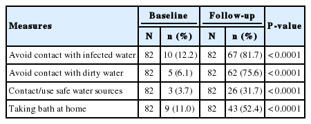 Contact/use safe water sources 82 3 (3.7) 82 26 (31.7) < 0.0001