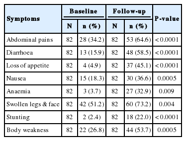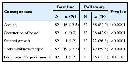 Respondents were also asked about the health consequences of intestinal worms if not treated in time. The key findings are presented in Table 8. Knowledge of respondents with regard to health consequences of intestinal worm infections were found to have increased significantly during the follow-up compared to the baseline survey. Many respondents mentioned ascites (swollen abdomen), obstruction of bowel, stunted growth, body weakness/fatigue, and poor cognitive performance during post-intervention survey than baseline. The differences were highly significant at P<0.0001 and P=0.0002.