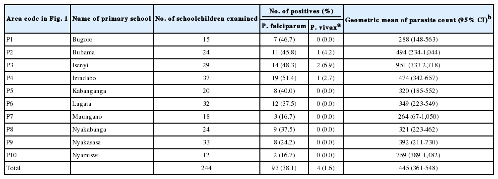 Table 1). Basic demographic data and results of the microscopic examination were analyzed using the SPSS version 18.0. The prevalence and quantitative values of malaria parasitemia were compared between schools. This study was approved by “An international cooperative project on schistosomiasis and other parasitic diseases control in Mwanza area, Tanzania (2008-2013)” between Good Neighbors International, Korea and Korea International Cooperation Agency (KOICA) from Korea and National Institute of Medical Research (NIMR) from Tanzania. Informed consent was obtained from the school guardians or teachers of each primary school.