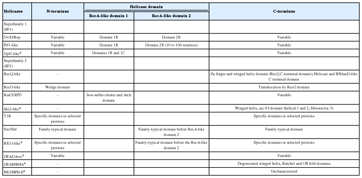 1]. They belong to the superfamilies 1 and 2 (SF1 and SF2) of helicases. Based on protein sequence, structure, and phylogenetic relationships, SF1 is divided into 3 families (UvrD/Rep, Pif1-like, and Upf1-like), while SF2 includes 9 families (RecQ-like, RecG-like, Rad3/XPD, Ski2-like, T1R, Swi/Snf, RIG-I-like, DEAD-box, and DEAH/RHA) and 1 group (NS3/NPH-II) (