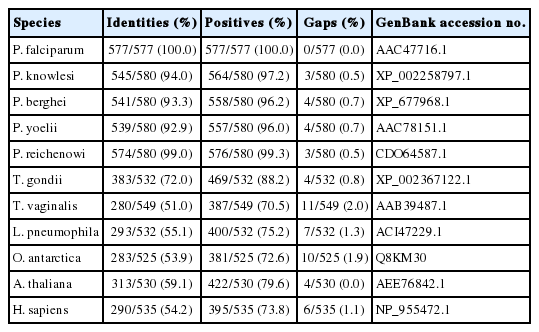 - 27. Soh BY, Song HO, Lee Y, Lee J, Kaewintajuk K, Lee B, Choi YY, Cho JH, Choi S, Park H. Identification of active Plasmodium falciparum calpain to establish screening system for Pf-calpain-based drug development. Malar J 2013;12:47.