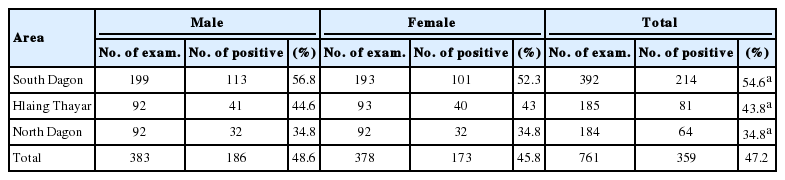 aThe egg positive rate was significantly higher (P<0.05) in South Dagon than in Hlaing Thayar and North Dagon.
