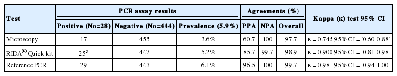 Table 2.Diagnostic performance parameters of PCR assay using 91 control fecal samples against a nominated composite gold standard test comprising microscopy, immunoassay, and a reference PCR assay