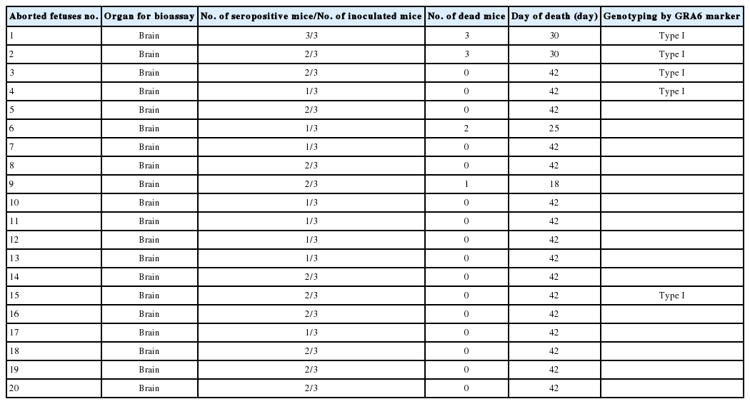 Aborted fetuses no. Organ for bioassay No. of seropositive mice/No. of inoculated mice No. of dead mice Day of death (day) Genotyping by GRA6 marker