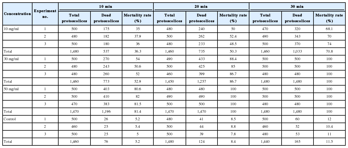 S. persica extract at a concentration of 50 mg/ml, meanwhile, killed 81.4%, 100%, and 100% of protoscolices after 10, 20, and 30 min, respectively.