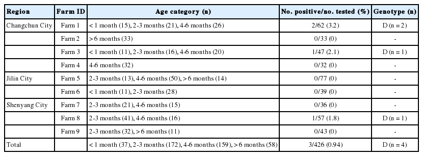 Changchun City Farm 1 < 1 month (15), 2-3 months (21), 4-6 months (26) 2/62 (3.2) D (n = 2)
