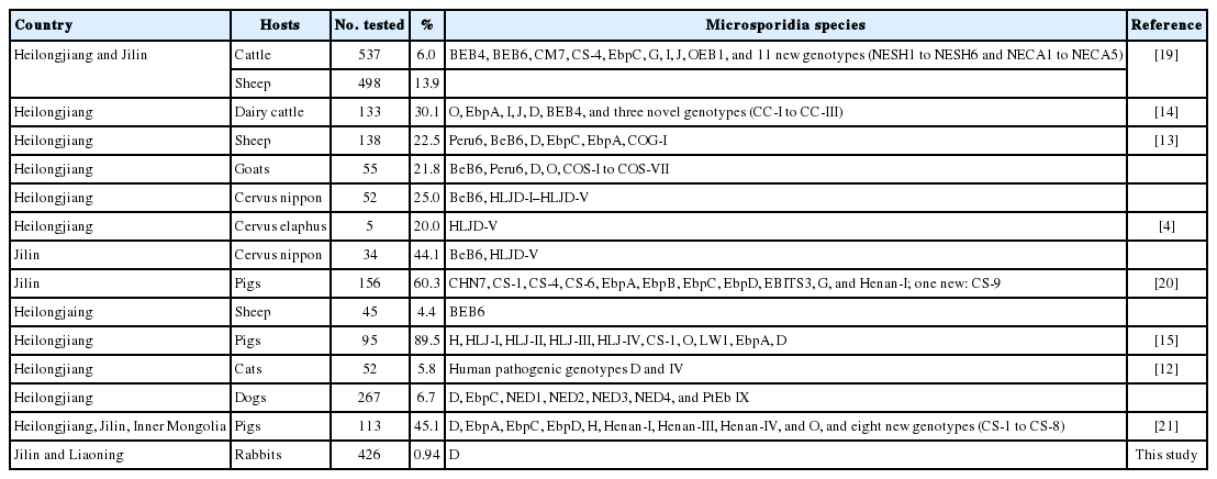 A total of 426 fecal samples were collected from Jilin (n=290) and Liaoning (n=136) province between May and June 2015. At the time of sampling, all the rabbits were in good health. Fresh fecal sample was collected from each animal using sterile disposal PE gloves after defecation onto the ground. All samples were sent to the laboratory, and then genomic DNA was extracted using an EZNAR Stool DNA kit (OMEGA Biotec, Madison, Wisconsin, USA) according to the manufacturer instructions, immediately. All the extracted DNA samples were stored at -20˚C until PCR analysis. Information concerning gender, geographic origin, and age were obtained by a questionnaire.