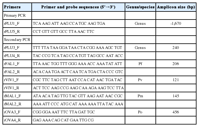 Plasmodium infection. Briefly, amplification was conducted using Accupower premix (Bioneer, Daejon, Korea) in a final volume of 20 µl, which included 250 nM primers, 0.25 mM each of deoxyribonucleoside triphosphate, 10 mM Tris-hydrochloric acid, 30 mM magnesium chloride, 1.0 unit of