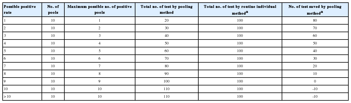 We also compared the total number of the test by routine individual handling of the samples with the maximum possible number of the test by this pooling method to estimate the effectiveness. According to this calculation, the parasite positive rate less than 9 was suitable for this pooling strategy (
