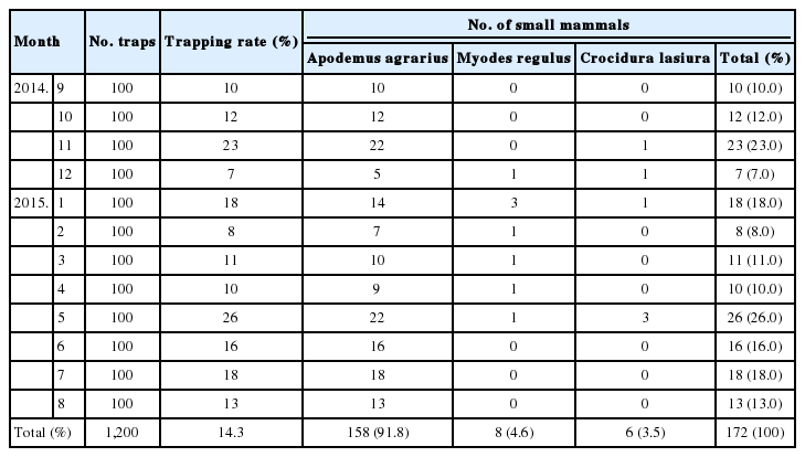 From September 2014 to August 2015, small mammals were collected using Sherman live traps (3"×3.5"×9", USA) in 2 regions (Gwangsangu and Bukgu) of Gwangju Metropolitan Area (MA), ROK. Collection sites were just within the city perimeter. The 2 regions where traps were installed were in a similar environment. Both included 5 types of locations. The locations were fallow ground, a ridge between rice fields, a boundary between forest and field, around tombs, and around water. Traps were baited with biscuits covered with peanut butter and set up in the late afternoon, and collected from 8-10 a.m, the following morning. Gwangju MA surrounded by Chonnam Province is a densely populated area (