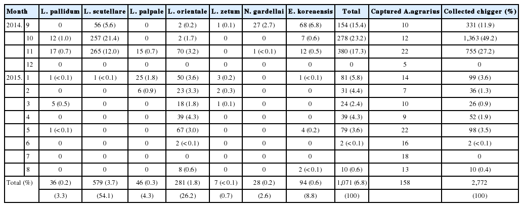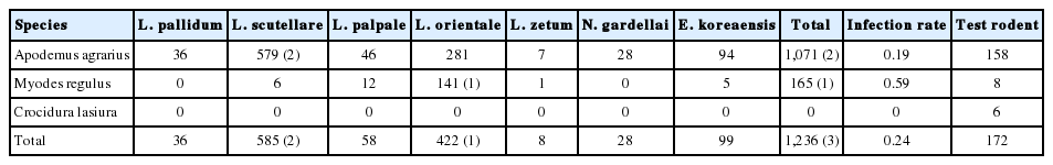 Table 5.Numbers of tested chigger mites (no. positive) assayed for O. tsutsugamushi by PCR in Gwangju MA, from Sepember 2014 to August 2015