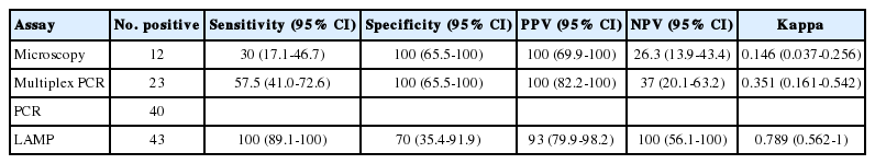 To validate the T. vaginalis LAMP, vaginal swab specimens were obtained from 50 female patients, with clinical suspicion of trichomoniasis, visiting obstetrics and gynecology clinics. These samples were subjected to the LAMP assay and 3 alternative available methods of T. vaginalis detection, including microscopic examinations, PCR, and multiplex PCR. The study was approved by the Institutional Review Board of Kyungpook National University Hospital (IRB no. KNUH 2013-04-051). Wet mount microscopy was performed at the clinic and classified as positive when motile trichomonads were observed. Genomic DNA was extracted from vaginal swab specimens using a QIAamp DNA mini kit (Qiagen, Hilden, Germany) and the diagnosis of T. vaginalis infection was made using the results of multiplex PCR and PCR that targeted Tvk [27] in triplicate, as previously described [31]. In this study, PCR was used as a gold standard and the sensitivity, specificity, positive predictive value (PPV), and negative predictive value (NPV) were calculated for each test (Table 2). The percentage sensitivities and specificities with 95% confidence intervals, differences in the sensitivities and specificities, and the degree of agreement were determined a previously described [31]. Of the 50 female patients, 12 (24%), 23 (46%), 40 (80%), and 43 (86%) were determined to be T. vaginalis positive using microscopy, multiplex PCR, PCR, and LAMP, respectively. All 40 positive specimens identified by PCR were positive using the LAMP assay. When PCR was used as the gold standard, the LAMP assay had the highest diagnostic sensitivity (P<0.001) and better agreement (kappa value: 0.789) with PCR than multiplex PCR and microscopy (Table 2). These findings indicate that the LAMP assay had a higher sensitivity for detection of samples infected with T. vaginalis compared to that of multiplex PCR and microscopic examination of wet mounts.