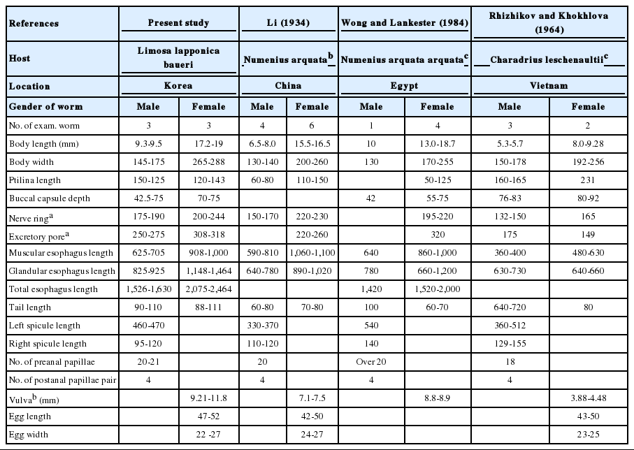 A bar-tailed godwit was rescued from the coastal region of Pyeongtaek-si (City), Gyeonggi-do (Province) in the Republic of Korea (=Korea) in 2012, although the exact date is not clear. The bird was an adult and died during treatment. Its visceral organs were stored in a -20˚C freezer in the CWARC and then donated in July 2014 to the Parasite Resource Bank in Korea (PRB) for parasitological examinations. At necropsy, 9 nematodes (4 females and 5 males) were found in the wall of the gizzard (