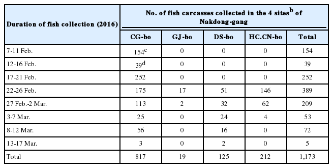 No. of fish carcasses collected in the 4 sitesb of Nakdong-gang