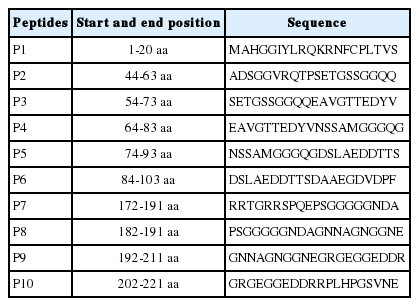 30]. In the present study, linear epitopes were analyzed using synthetic peptide techniques and bioinformatics tools, and 3 of the 10 predicted epitope peptides were confirmed by synthetic peptide techniques. The use of a molecular biology method in combination with a bioinformatics method is a useful method to screen for linear epitopes.