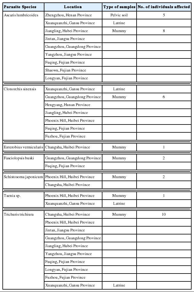 - 9. Wei YY, Weng Y, Zhang JZ, Fan WQ, Xin YJ. Archaeoparasitological report on abdominal burial soil from the Zhengzhou Jinshui and Xinzheng Lihe cemeteries. Acta Anthropol Sin 2012;31:415-423. (in Chinese).