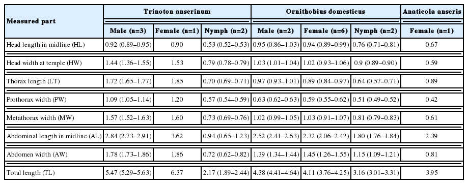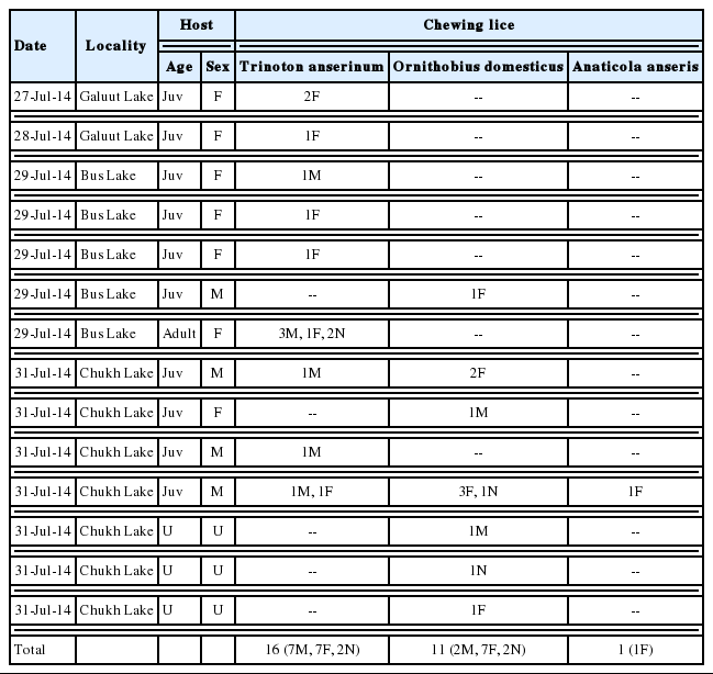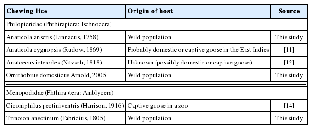 Table 1). All of these 3 species were new to the swan goose, resulting in a total of 6 chewing lice species in 2 parasitic families and suborders: Philopteridae (Ischnocera) and Menopodidae (Amblycera) (