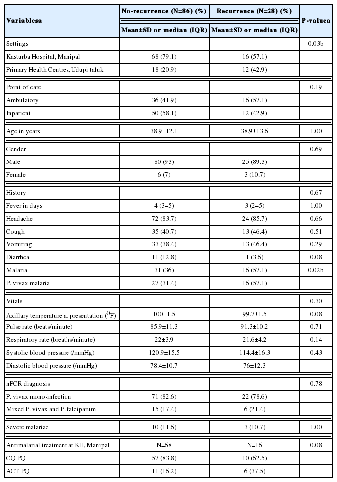 P. vivax parasitemia as confirmed by light microscopy was considered the primary outcome. All reappearances were considered ‘recurrence’ as molecular investigations to differentiate cases into either ‘relapse’ or ‘reinfection’ was not performed. Demographic, clinical, and laboratory variables were compared between ‘no-recurrence’ and ‘recurrence’ groups to determine mutual associations. Severity of