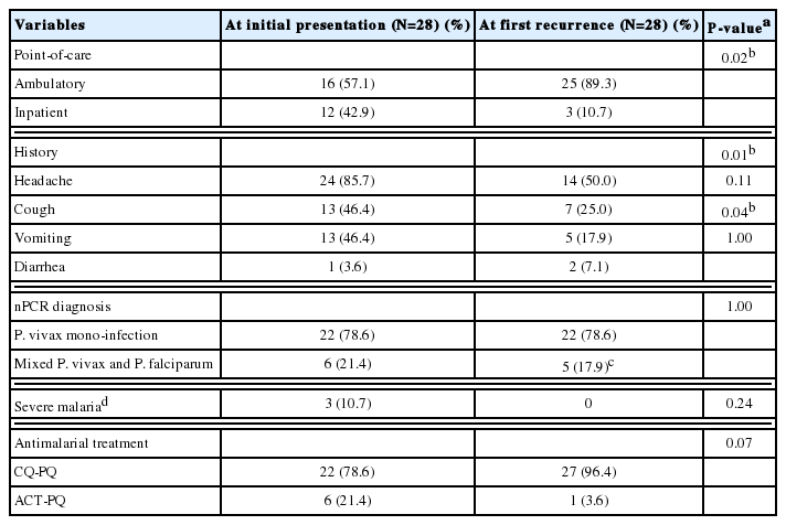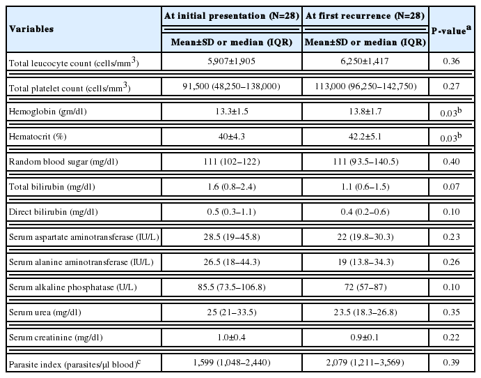 P=1.00) between recurrence and no-recurrence groups. Of 28 cases in recurrence group, 3 (10.7%) had severe malaria initially; however, none developed severe malaria during subsequent recurrences.