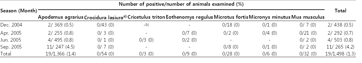 Total Apodemus agrarius Crocidura lasiuraa) Cricetulus triton Eothenomys regulus Microtus fortis Micronys minutus Mus musculus Dec. 2004 2/ 369 (0.5) 0/43 (0) -b) - 0/18 (0) 0/1 (0) 0/ 7 (0) 2/ 438 (0.5) Apr. 2005 2/ 255 (0.8) 0/ 3 (0) - 0/7 (0) 0/2 (0) 0/4 (0) 0/21 (0) 2/ 292 (0.7) Jun. 2005 4/ 495 (0.8) 0/ 1 (0) 0/3 (0) 0/2 (0) - - 0/ 2 (0) 4/ 503 (0.8) Sep. 2005 11/ 247 (4.5) 0/ 7 (0) - - 0/8 (0) 0/1 (0) 0/ 2 (0) 11/ 265 (4.2) Total 19/1,366 (1.4) 0/54 (0) 0/3 (0) 0/9 (0) 0/28 (0) 0/6 (0) 0/32 (0) 19/1,498 (1.3)