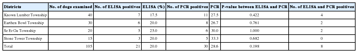 Districts No. of dogs examined No. of ELISA positives ELISA (%) No. of PCR positives PCR P-value between ELISA and PCR No. of ELISA and PCR positives