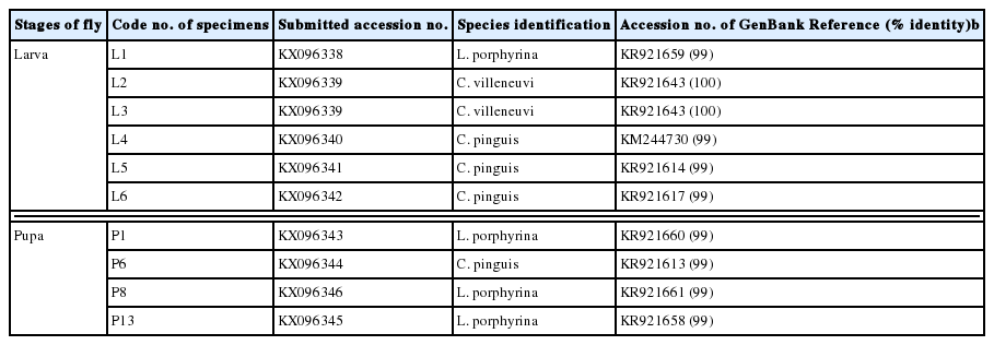 Table 1Species identification of immature stages of Thai blow flies collected from human remains based on partial COI sequences (1,247 bp)