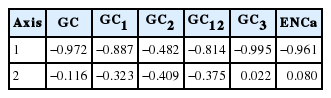 Table 3Correlation between tyrosinase gene position on axis 1 and axis 2 and nucleotide compositions in different codon positions