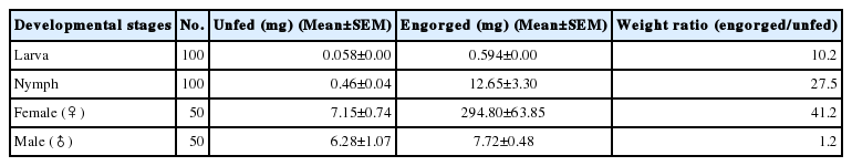 Developmental stages No. Unfed (mg) (Mean±SEM) Engorged (mg) (Mean±SEM) Weight ratio (engorged/unfed)