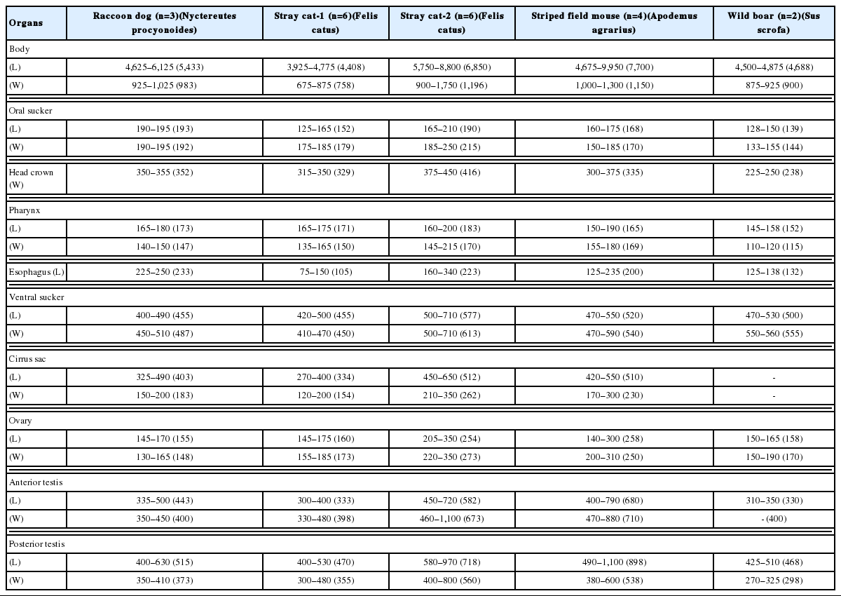 27] used only 4 worm specimens donated by a Korean parasitologist. Therefore, we seriously needed to describe the differential morphological indices derived from a variety of worm samples to support the taxonomic validity. In addition, new definitive hosts of this fluke, the raccoon dog and wild boar, were reported in this study.