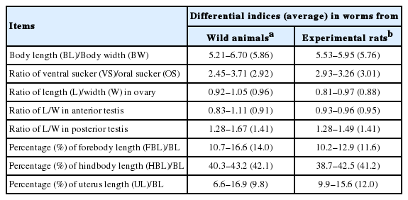 The ratios of BL to BW were 5.21–6.70 (5.86 in average) and 5.53–5.95 (5.76) in worms from wild animals and experimental rats, respectively. Those of VS to OS were 2.45–3.71 (2.92) and 2.93–3.26 (3.01) in worms from 2 groups. The ratios of length/width of the ovary were 0.92–1.05 (0.96) and 0.81–0.97 (0.88), those of the anterior testis were 0.83–1.11 (0.91) and 0.93–0.96 (0.95), and those of the posterior testis were 1.28–1.67 (1.41) and 1.28–1.49 (1.41) in worms from 2 groups, respectively. The percentages of FBL to BL were 10.7–16.6 (14.0) and 10.2–12.9 (11.6), and those of HBL to BL were 40.3–43.2 (42.1) and 38.7–42.5 (41.2) in 2 groups. The percentages of uterine field (U) to BL were 6.6–16.9 (9.8) and 9.9–15.6 (12.2) in 2 worm groups (