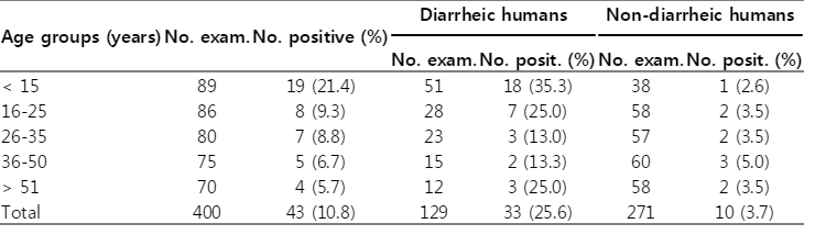 Cryptosporidium sp. was detected in 33 (25.6%) and 10 (3.7%) of diarrheic and non-diarrheic humans, respectively. The majority of the diarrheic humans (39.5%) were younger than 15 years and 18 (35.3%) of them were positive for