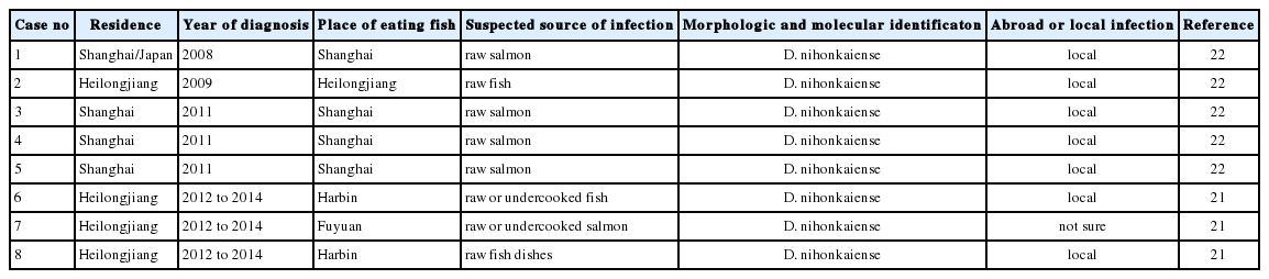 - 21. Zhang W, Che F, Tian S, Shu J, Zhang X. Molecular identification of Diphyllobothrium nihonkaiense from 3 human cases in Heilongjiang Province with a brief review in China. Korean J Parasitol 2015;53:683-688.